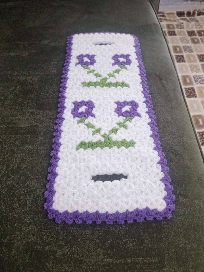 Mor kenarlı, beyaz zemin üzerinde mor ve yeşil çiçek desenli, dokulu ve el örgüsü banyo lifi.