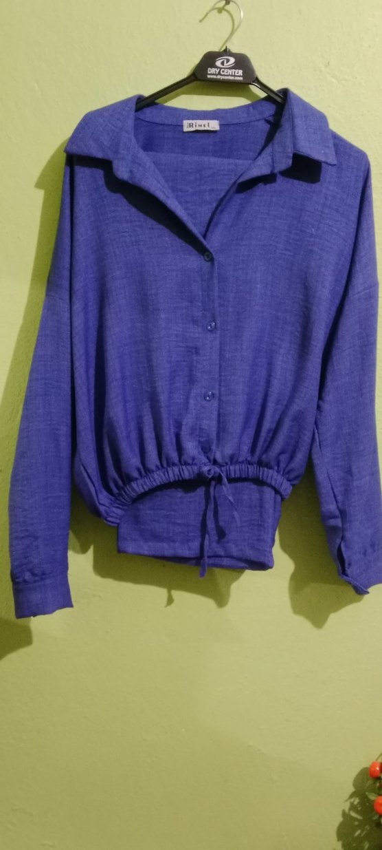 Mor renkli keten, düğmeli, yakalı ve uzun kollu, bol kesim kısa boy kadın gömleği. Bel kısmında bağcık detayı bulunur, günlük ve sokak stili için uygundur. ikili takım