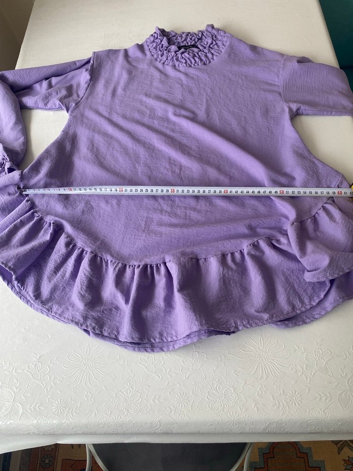 Mor keten kumaştan, fırfırlı yakalı ve etek ucu detaylı, bol kesim, uzun kollu bluz.Ölçüler ve bilgileri resimlerde mevcuttur