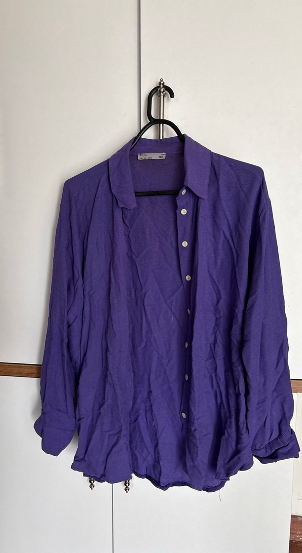 Mor renkte, keten kumaştan, düğmeli ve notlu yaka detaylı, uzun kollu, bol kesim kadın gömlek.