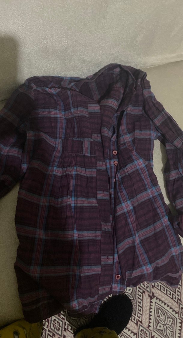 Düğmeli, yakalı ve uzun kollu mor keten kadın gömleği. Rahat kesimi ve midi boyuyla günlük ve sokak stiline uygun.