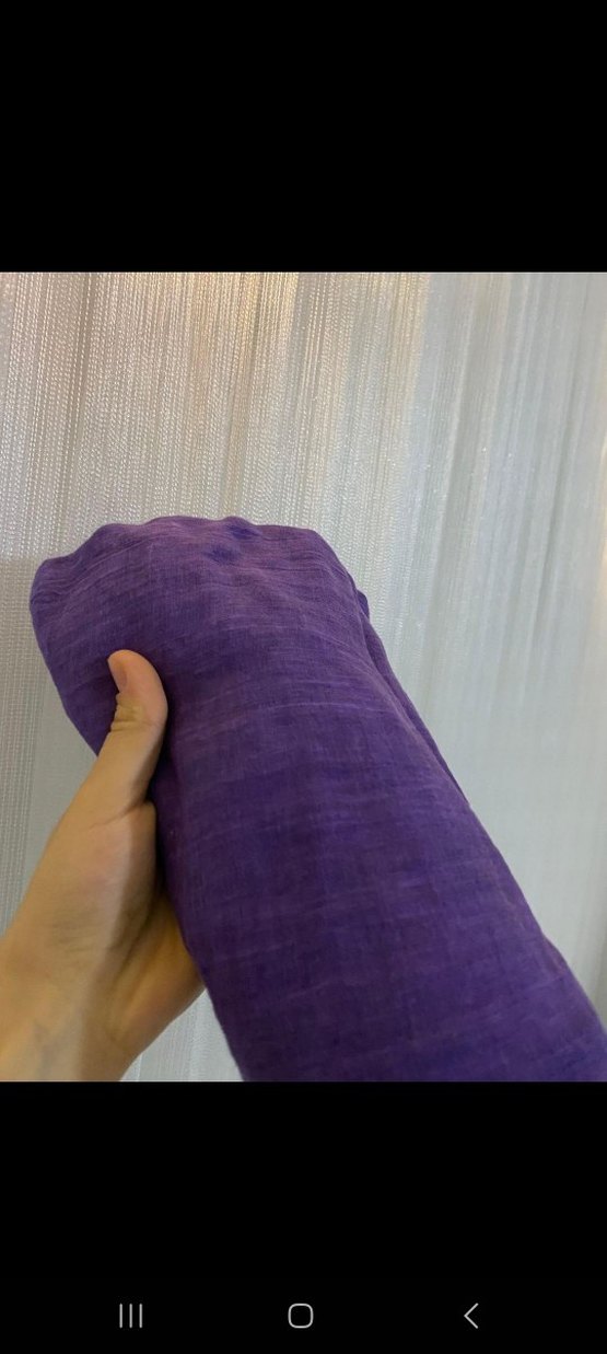 Parlak mor renkte, yumuşak keten kumaştan yapılmış, dökümlü kadın şalı, rahat ve bohem tarzı yansıtıyor.