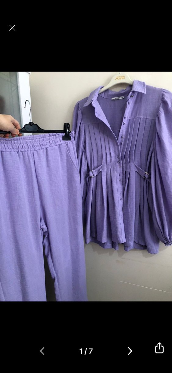 Mor pastel renkte keten kumaştan, düğmeli uzun kollu, kısa mini kadın takımı. Notlu yakalı üst ve lastikli pantolon ile rahat kesim sunar. Bir kere giyildi