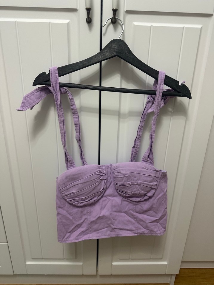 Mor keten kumaştan, askılı ve straplez, kısa kesim mini büstiyer. Rahat ve şık günlük kullanım için uygun.