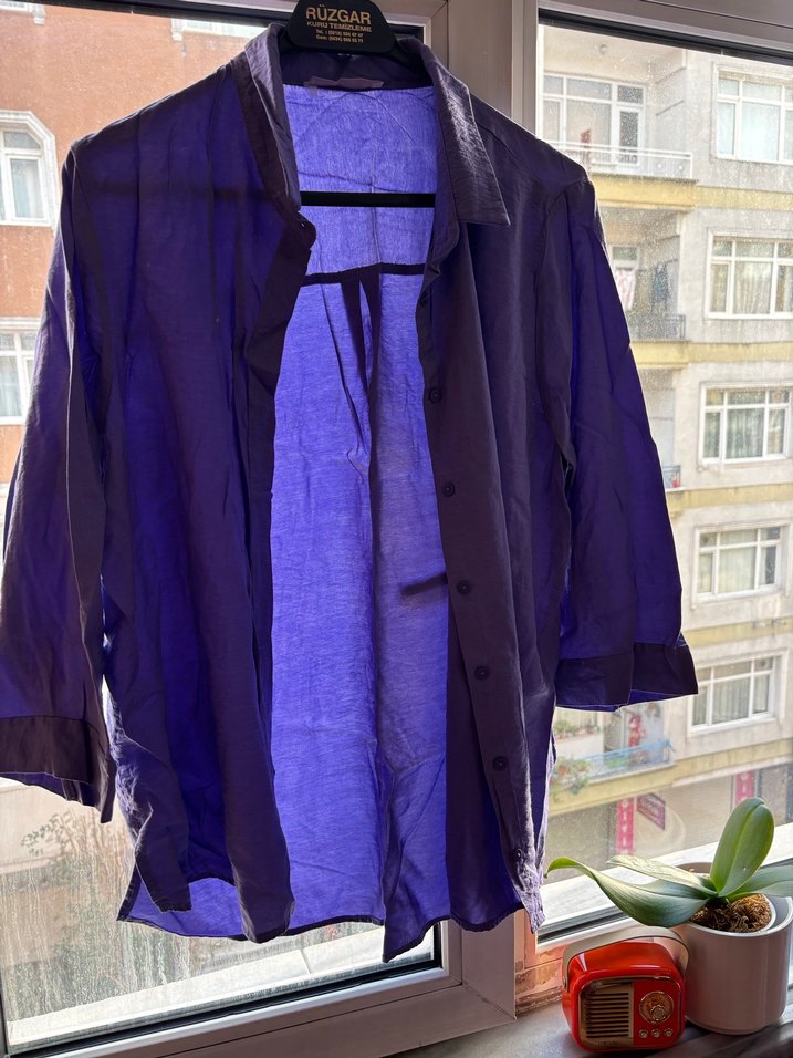 Mor keten kumaştan, salaş kesim, normal midi boyda, uzun kollu ve yakası kesik detaylı gömlek. Günlük kullanıma uygun şık bir parça.