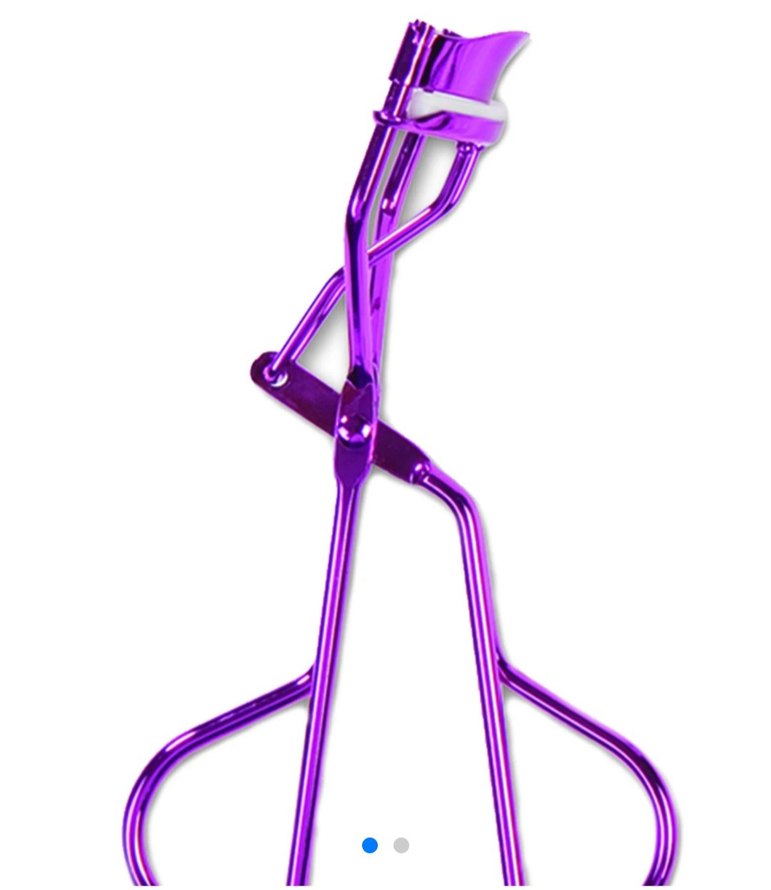 Canlı mor metalik renkte kirpik kıvırıcı, kirpikleri şekillendirmek için tasarlanmıştır.