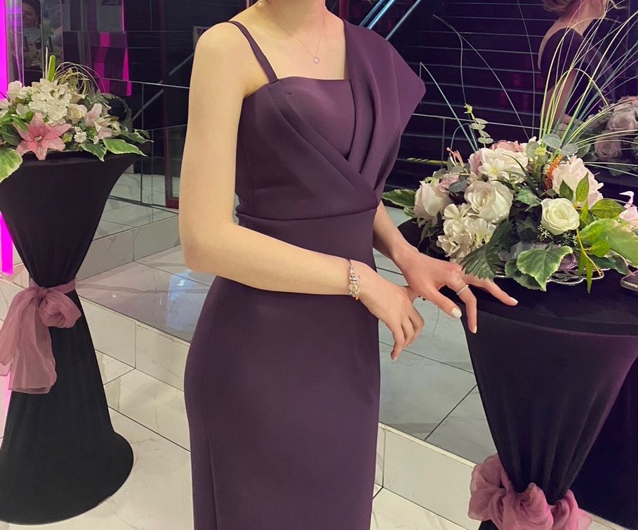 Koyu mor renkte, kolsuz ve vücuda oturan kısa abiye elbise, drapeli detaylarıyla düğün için uygun klasik şıklık sunar.