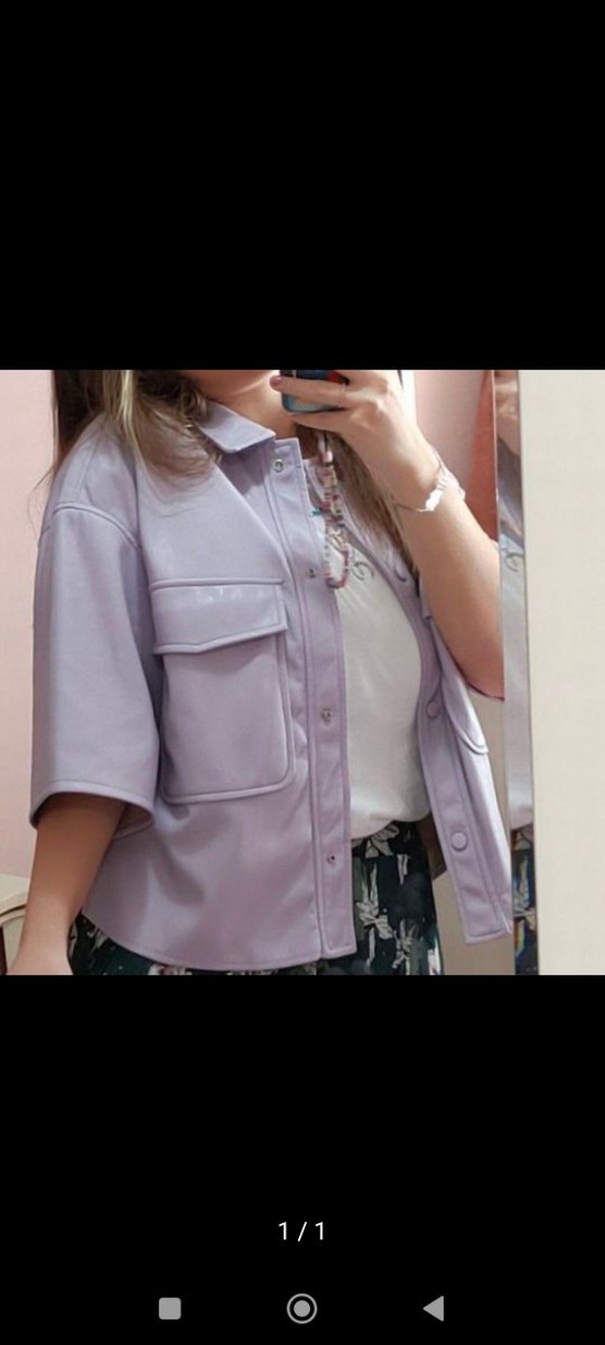 Mor renkte, kısa kollu deri ceket, yakalı ve düğmeli tasarıma sahip. Salaş kesimi ve hafif batik deseniyle rahat bir stil sunar.