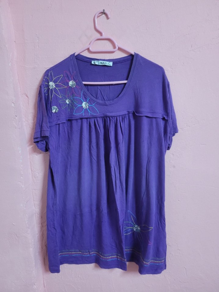 Mor renkte, kısa kollu ve yuvarlak yakalı bluzu. Salaş kesim ve drapeli, çiçek işlemeli, günlük kullanıma uygun.