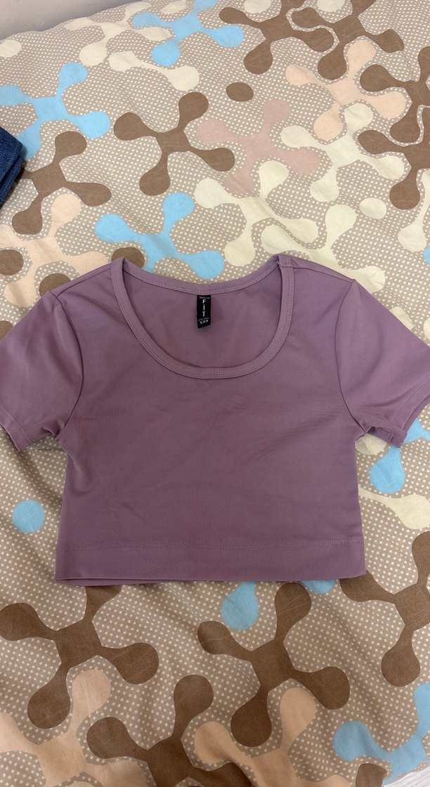 Mor renkte, kısa kollu ve yuvarlak yakalı, vücuda oturan crop top. Yumuşak sentetik kumaştan, günlük rahat ve sokak stili için uygun.