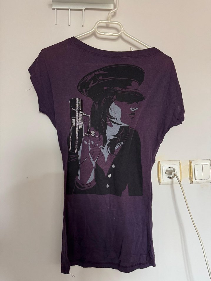 Mor, kısa kollu ve bisiklet yakalı tişört, ipeksi kumaştan yapılmıştır. Koyu goth baskı ve kemerli detay içerir, gündelik kullanıma uygundur.