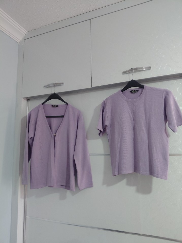 triko takım , hırka ve kısa kollu kazak , Mor renk, kısa kollu keten kumaştan, yuvarlak yakalı ve bol kesim kadın tişörtü, minimal ve rahat şıklık sunar.