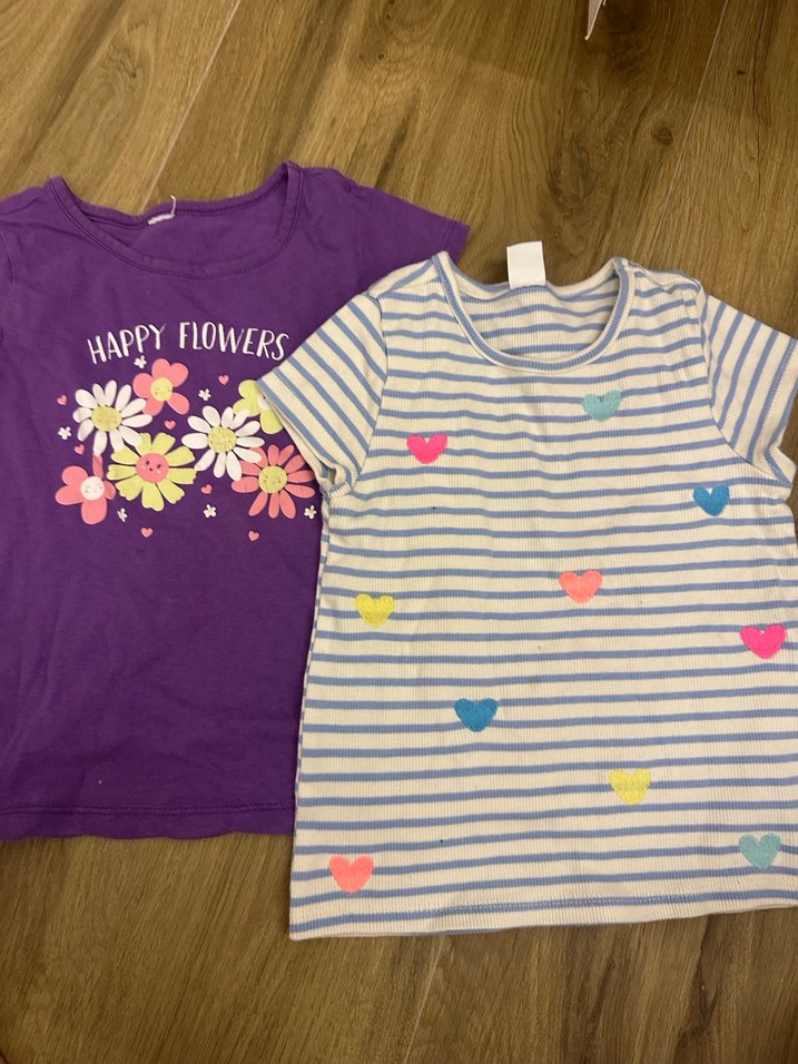 Mor renkli, pamuklu, kısa kollu kız tişörtü. Bol kesim ve yuvarlak yaka, önünde "HAPPY FLOWERS" yazılı renkli çiçek baskısı bulunur.