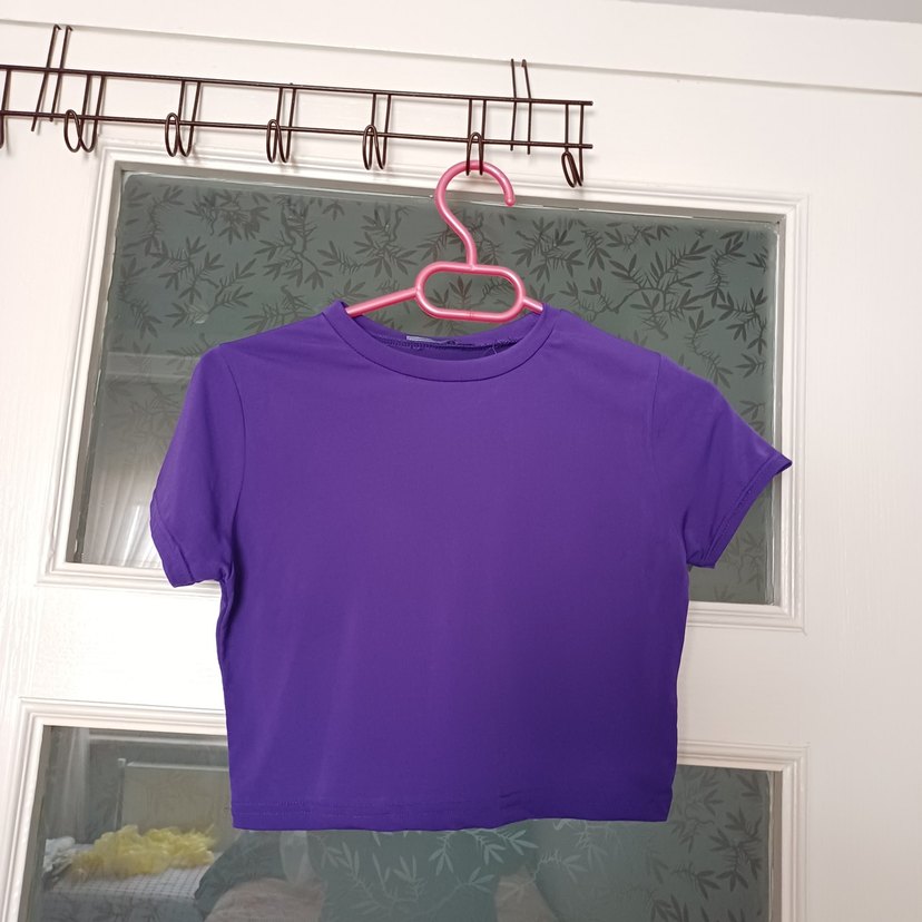 Mor renkli, kısa kollu ve bisiklet yaka kız tişörtü, rahat ve renkli sokak stili için sentetik kumaştan üretilmiştir.