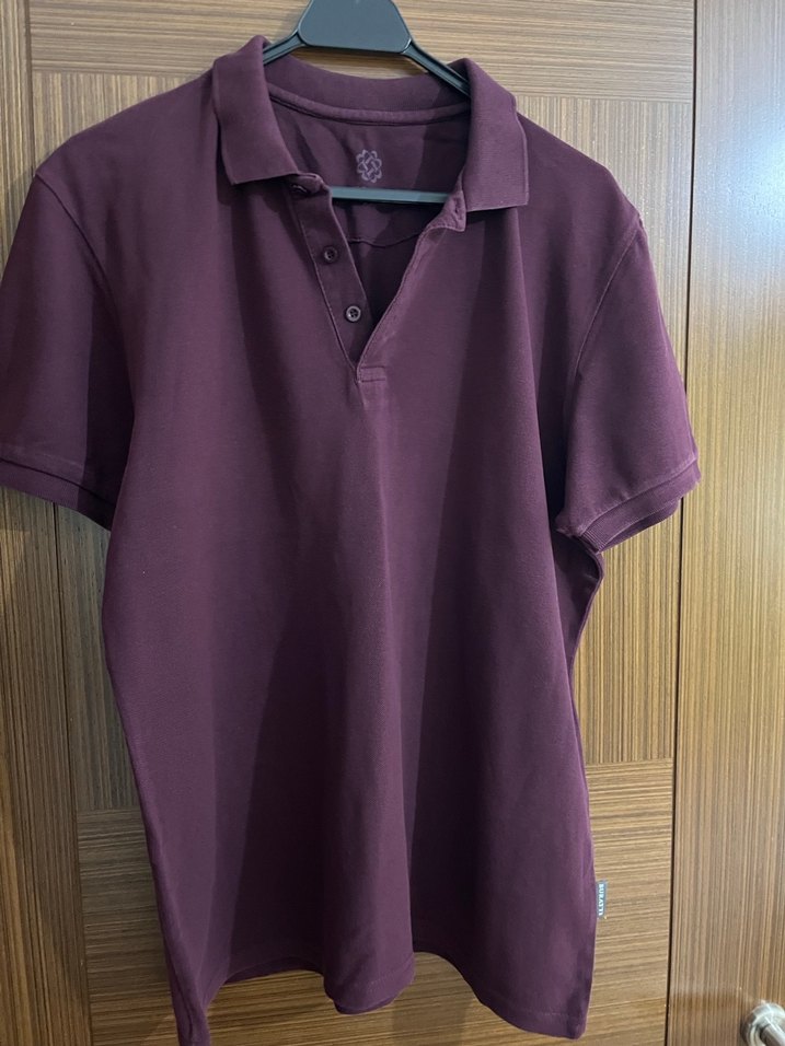 Mor renkte, düğmeli yakalı kısa kollu erkek polo tişört. Vizkoz yani pamuklu kumaştan, normal boy ve rahat kesimlidir. Günlük sokak stili için uygundur. Xxl beden yazıyor ama kalıbı dar l bedene gayet uygun.