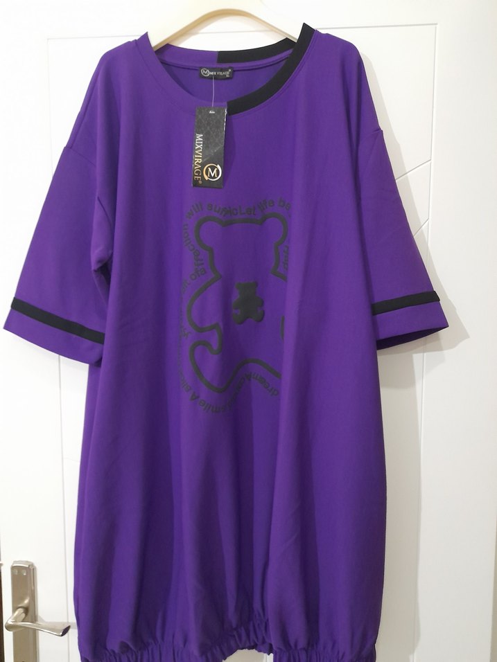 Mor renk, kısa kollu, yuvarlak yaka ve baskılı ayıcık deseni olan bol kesim Yumuşak ve esnek kumaş elbise spor tunik olacakta kullanılır taytlarlada olur