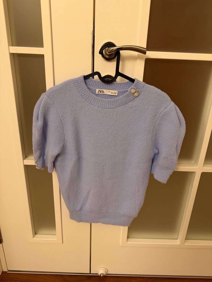 Pastel mor renkte, yuvarlak yaka ve kısa kollu örgü kadın kazak. Kollarında ve yakasında düğme detaylı. Salaş kesimi ve kısa boyu ile rahat sokak stiline uygundur. Günlük kullanıma uygun, konforlu örgü kumaş.