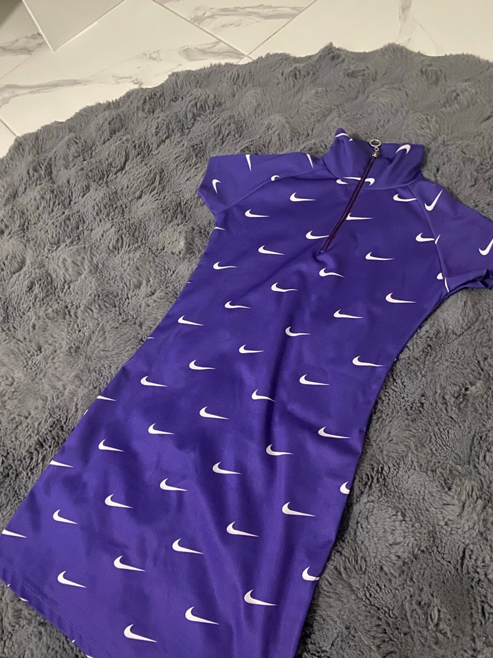Kısa kollu, uzun boylu, mor renkte ve canlı desenli, spor tarzda kadın elbisesi. Yaka kısmında fermuar detayı bulunur.