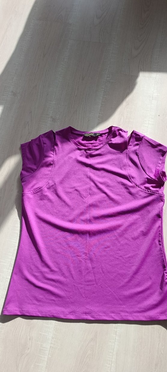 Mor renkli, kısa kollu, yuvarlak yaka, vücuda oturan spor tişörtü. Düz ve renkli tasarımıyla günlük sokak stiline uygundur.