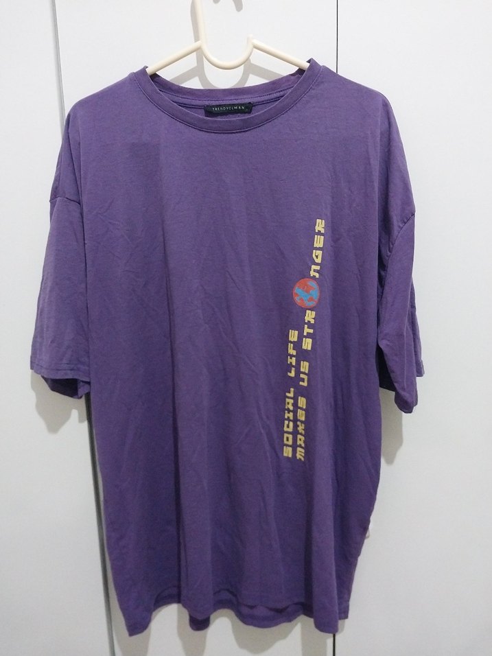 Mor renkte, kısa kollu, yuvarlak yaka tişörtü. Baskılı detaylara sahip, bol kesim ve ipeksi dokulu kumaştan, günlük rahat kullanıma uygundur.