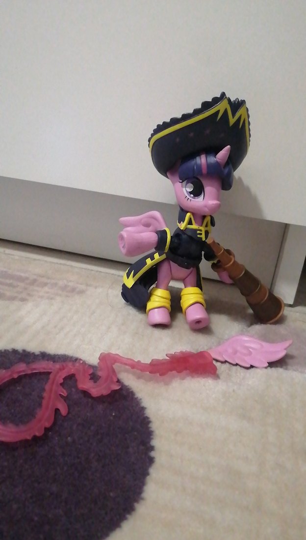 Mor renkte, koyu renk ve sarı detaylı kıyafet giymiş, sopalı ve pembe saydam aksesuarı olan aksiyon figürü.