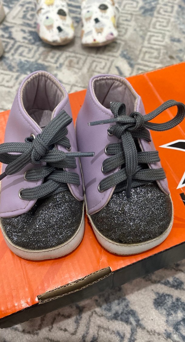 Mor ve gri renkli, cırt cırtlı, lastik tabanlı kız bebek ilk adım ayakkabısı. Desensiz ve rahat kullanımlı.