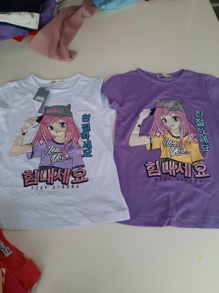 Mor pastel renkte, kısa kollu, bol kesim kız çocuk tişörtü. Baskılı anime tarzı figür ve yazılar içerir. Sokak modasına uygun rahat bir parça.