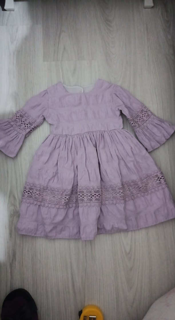 Pastel mor keten kumaştan, bol kesim kız çocuk elbisesi. Uzun kollu ve kayık yaka, fırfır ve nakış detaylarıyla bohem tarzda.