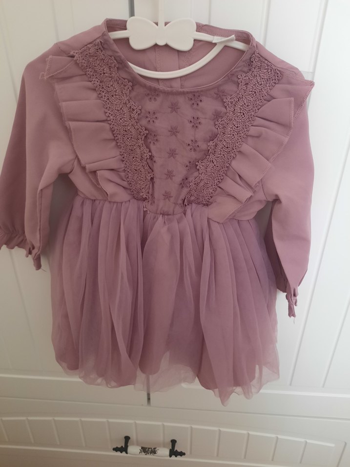 Pastel mor renk, uzun kollu, yuvarlak yakalı kız çocuk elbisesi. Nakış ve fırfır detayları ile bohem tarz sunar. Rahat ve dökümlü kesimle klasik şıklık sağlar.
