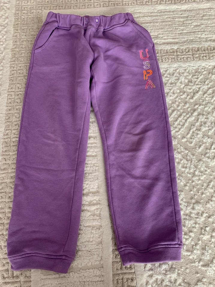 Mor renkte, rahat kesim ve yandan ceplere sahip kız çocukları için yumuşak kumaştan eşofman altı. Pastel tonlarda sokak modası tarzı.6-7 yaş