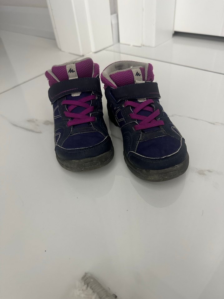 Mor renkli kız çocuk spor ayakkabısı, velcro bantlı ve kauçuk tabanlıdır. Rahat ve günlük sokak stili için uygundur.