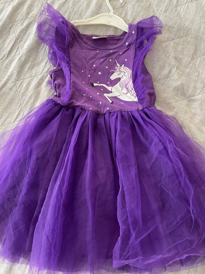 Mor renkli, omuzları fırfırlı, unicorn baskılı kız çocuk elbisesi.