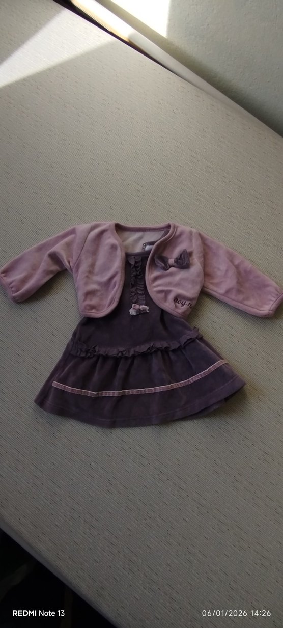 Mor, uzun kollu ve fırfırlı kız çocuk elbisesi, pudra kısa hırka ile kombinlenmiştir. Soğuk günler için uygundur.