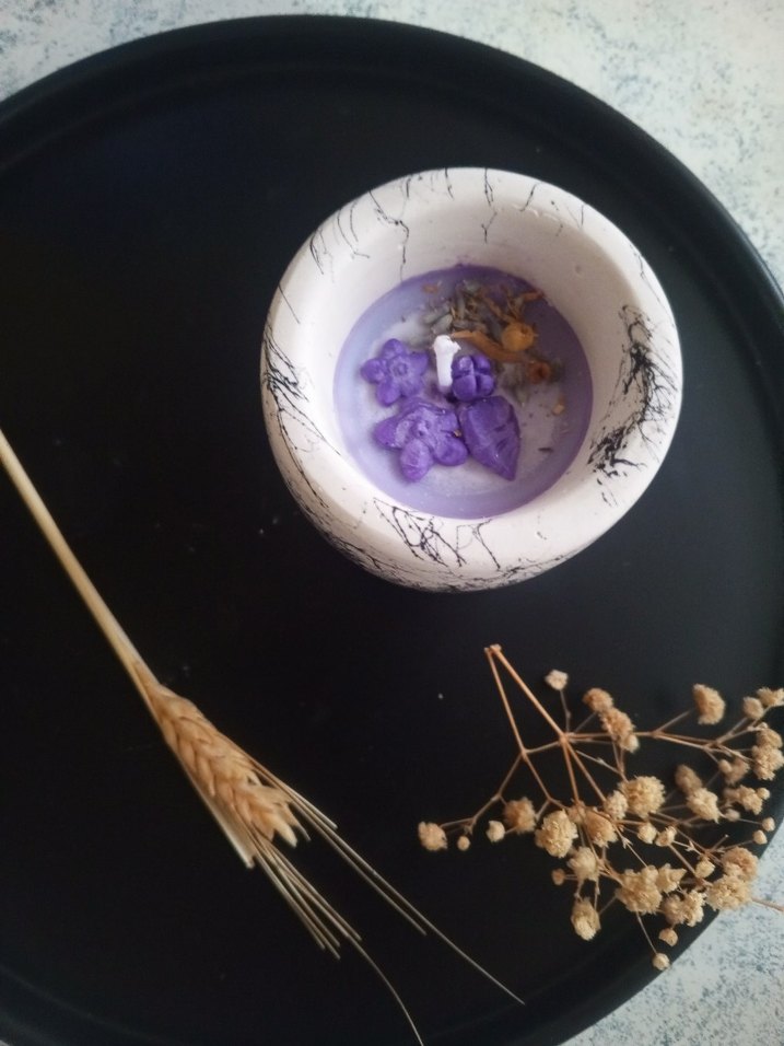 Siyah mermer desenli beyaz tutucuda koyu mor kokulu mum ve kuru çiçekler. Mekâna dekoratif bir dokunuş sağlar. ️Tamamen el yapımıdır lavanta esansı doğal soya wax içerir