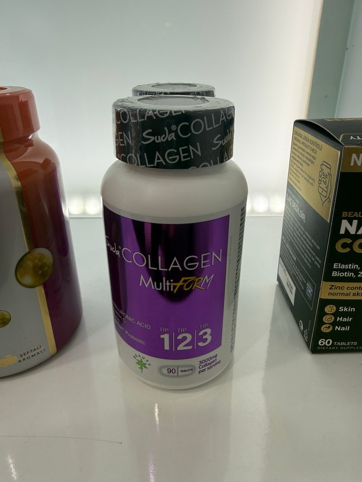 Mor renkli Kollajen MultiFORM tozu, 90 kapsül içerir ve cilt, saç ile tırnak sağlığını destekler.