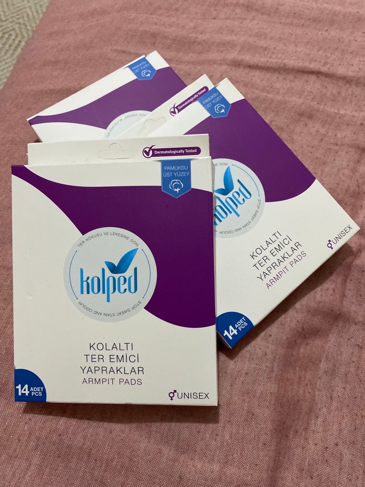 Pastel mor renkli Kolped ter emici kolaltı pedleri, teri emmek ve konfor sağlamak için tasarlanmıştır. Dermatolojik olarak test edilmiştir, unisex ve 14 adet içerir. 3 paket