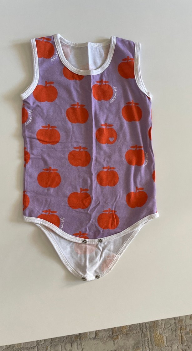 Kolsuz, yuvarlak yakalı bebek kız body. Pastel mor zemin üzerine canlı turuncu elma desenleri bulunur. Yumuşak ve rahat kumaş.