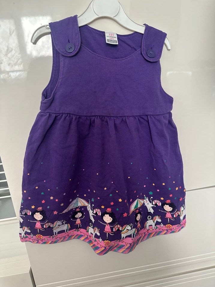 Mor renkte, kolsuz, bol kesim kız çocuk elbisesi. Etek kısmında renkli baskılar ve fırfır detayları bulunur, askılar düğmelidir.