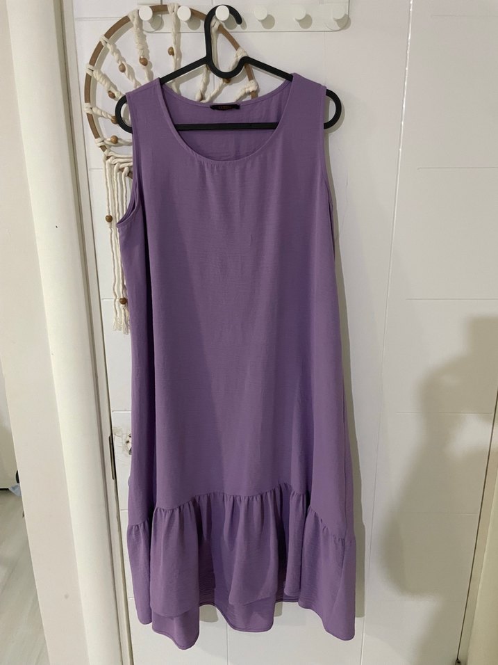 Mor renkli kolsuz midi elbise, kaygan kumaştan, bol kesim ve etek ucu fırfırlı, yuvarlak yaka ile sade bir tarz sunar. 1 kere giyildi arkası uzun model