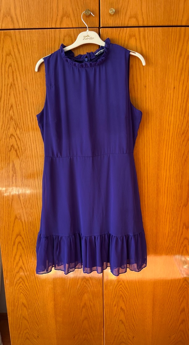 Yüksek yakalı, kolsuz ve vücuda oturan bu midi elbise, yakada ve etekte fırfır detaylara sahiptir. Pürüzsüz sentetik kumaştan yapılmıştır, romantik anlar için bohem tarzına uygundur.