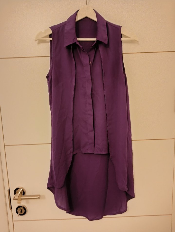 Kolsuz, yakalı, midi boy, mor renkli, dökümlü tasarımlı, ipeksi kumaştan kadın gömleği. Minimalist ve günlük kullanım için uygun.