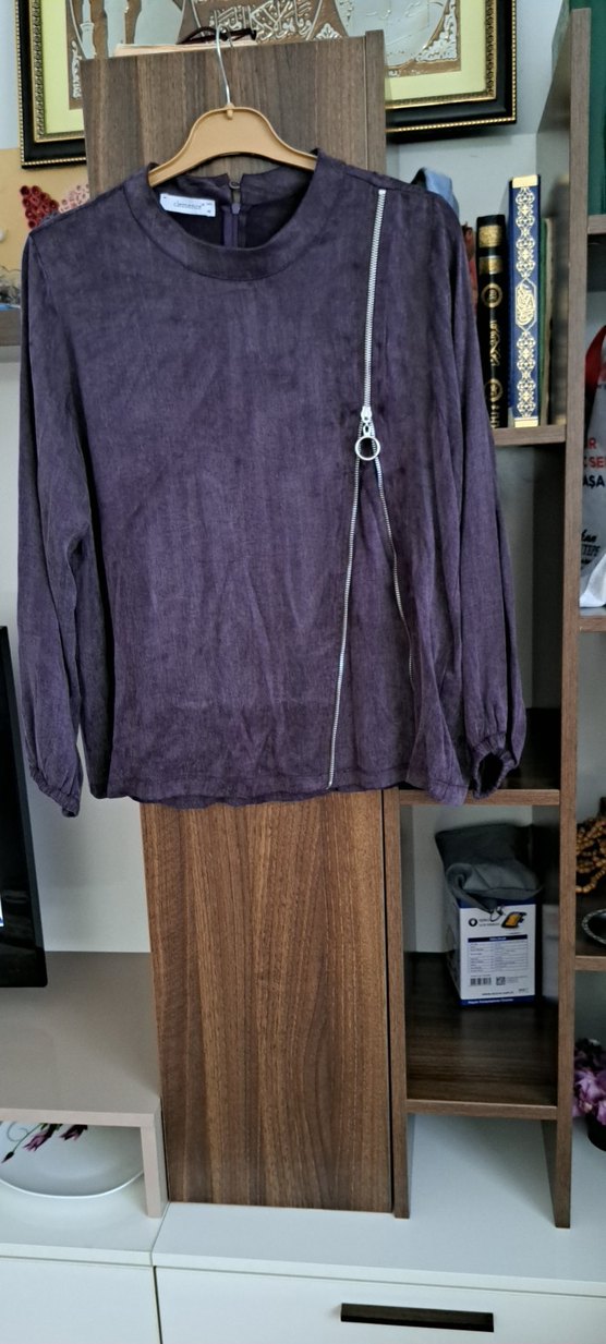 Mor kopra kumaştan, uzun kollu ve yuvarlak yakalı bu bluz, önde fermuar detayına sahiptir. Salaş kesim ve midi uzunluktadır, günlük rahat şıklık sunar.