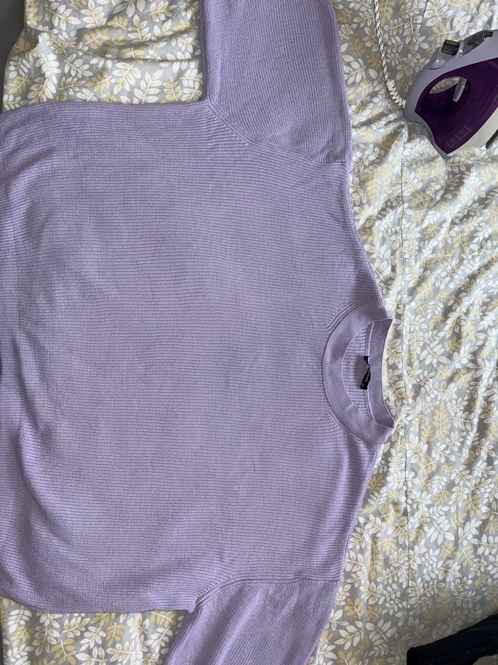 Mor, yuvarlak yakalı örgü kazak. Rahat kesimi ve günlük kullanıma uygun rahat tarzıyla dikkat çeker.