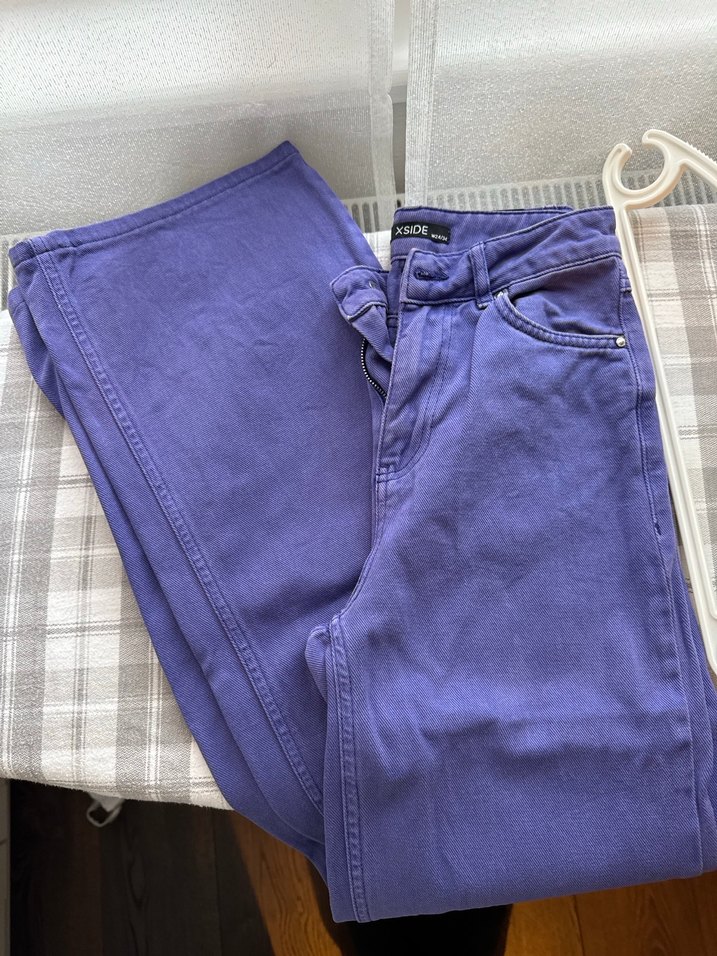 Bol kesim, koyu mor renkte denim kot pantolon. Günlük kullanıma uygun rahat ve şık bir modeldir.