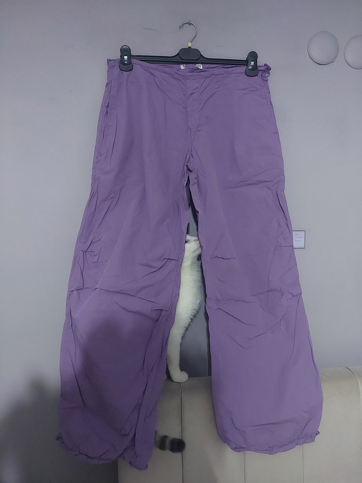Mor/koyu lila renkte, ve bol kesim kadın pantolonu, rahat ve şık bir dış mekan görünümü sunar. Paraşüt kumaşlıdır, belinde ve bileklerinde de lastik mevcuttur.