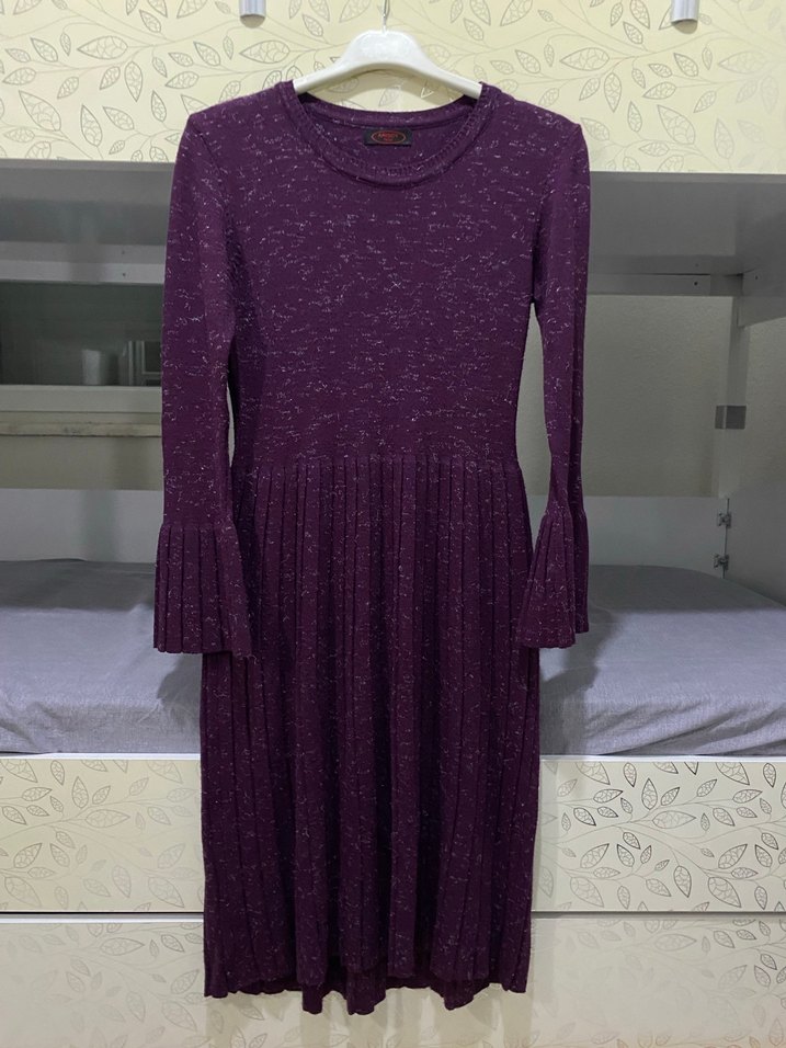 Koyu mor renkli, triko kumaştan yapılmış, pilili uzun ve vücuda oturan bir elbisedir. Yuvarlak yaka ve pilili uzun kollara sahiptir, rahat ve günlük kullanıma uygundur.