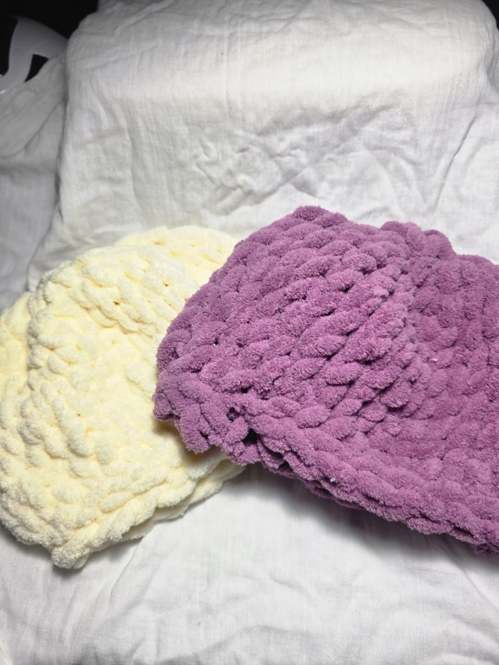 Renkli ve yumuşak dokulu, mor-krem örgü bere. Sıcak tutar ve rahatlık sağlar. 2'li satılır. Renkleri değiştirebilirsiniz. Ürünler el işidir