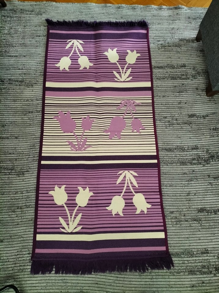 boy 150 cm en 80 cm çift taraflı mor beyaz lale çiçek desenli püsküllü yolluk kilim #yolluk #kilim #halı #morhalı #morkilim #moryollluk İşlemeli çiçek desenlerine ve püsküllü kenarlara sahip, açık mor renkli konvansiyonel halı. Krem ve mor tonlarıyla sade bir dekorasyon sunar.