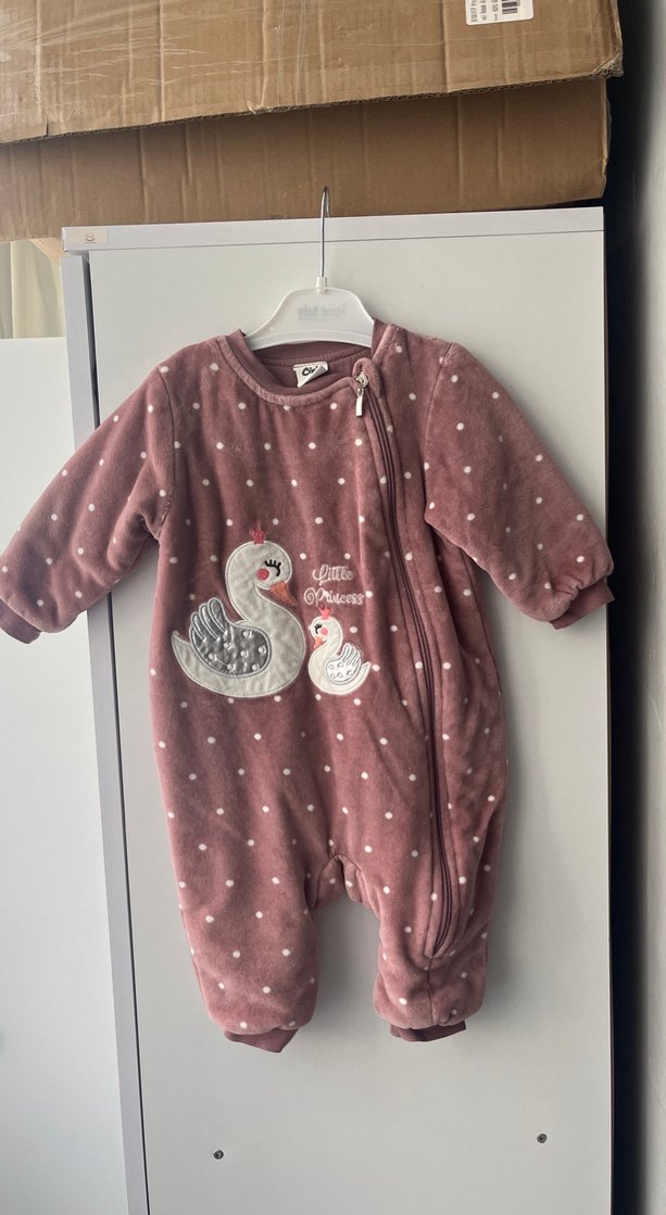 Mor zemin üzerine beyaz puantiyeler ve baskılı kuğu deseni bulunan bebek uyku tulumu. Uzun kollu ve yan fermuarlı.2.5 tog Çok az giyildi kolunun alt kısmında küçük bir sökülme oldu çok belli olmuyor