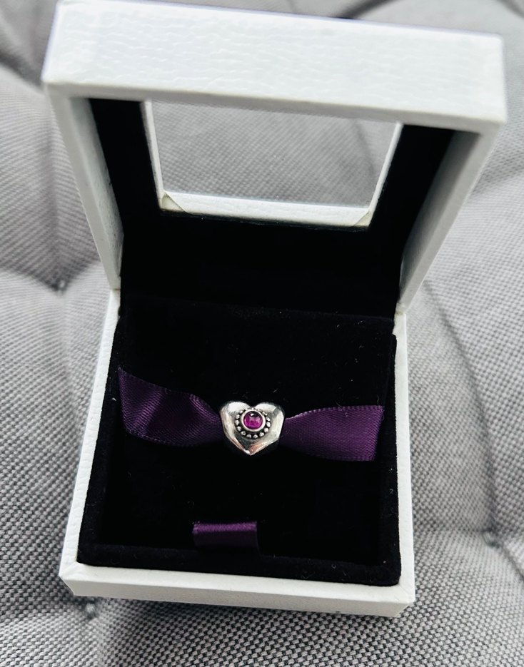 Mor kurdeleye bağlı, gotik tarzda baskılı gümüş kalp ve mor taşlı kadın charm, romantik akşamlar için ideal.